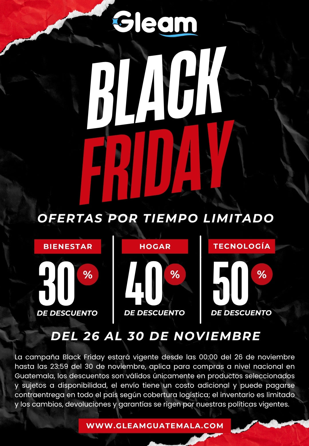 - Los descuentos son válidos únicamente sobre los productos seleccionados y debidamente señalados como parte de la campaña Black Friday.